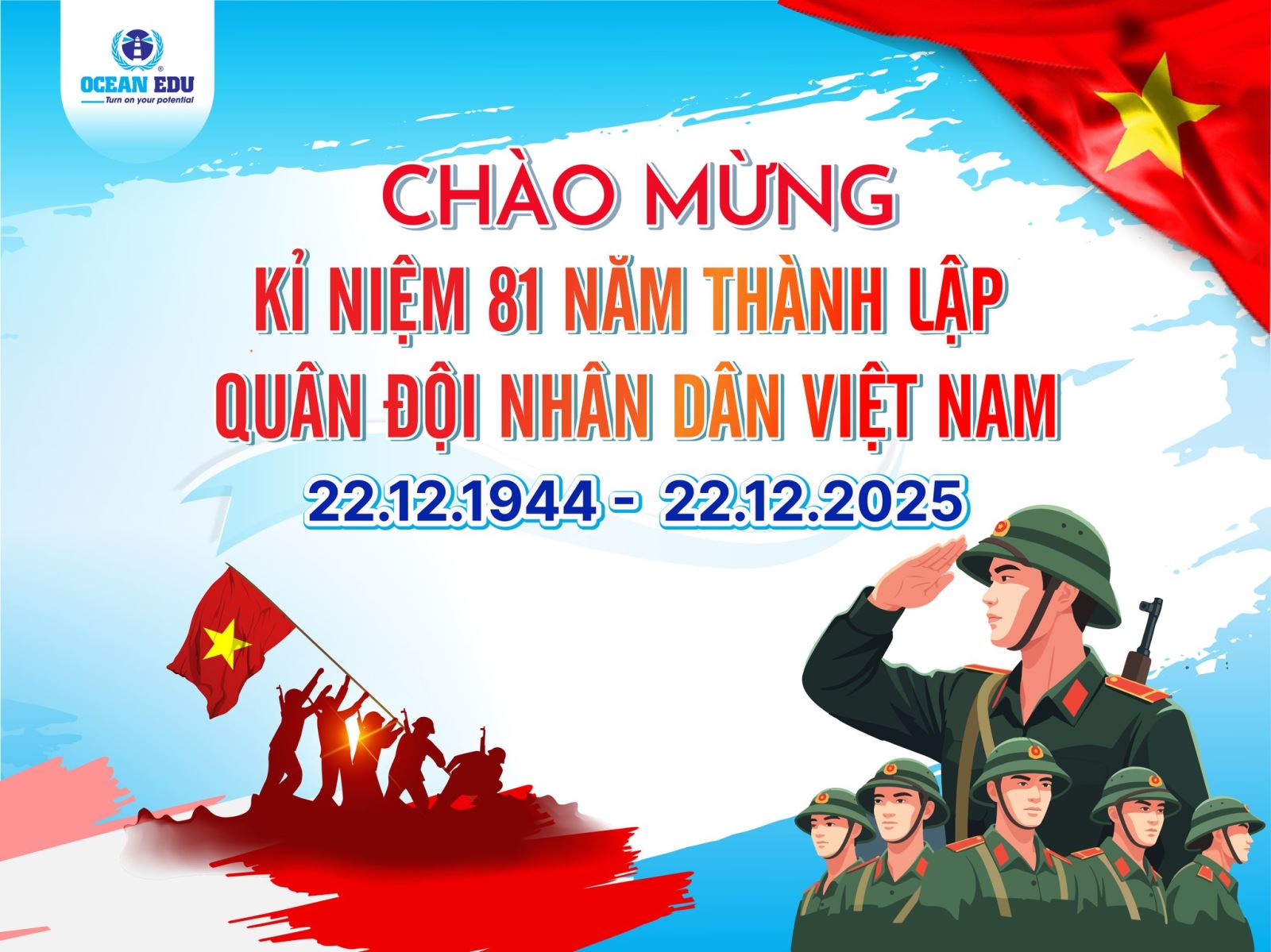 Nhân dịp kỷ niệm 81 năm Ngày thành lập Quân đội Nhân dân Việt Nam (22/12/1944 – 22/12/2025), Hệ thống Anh ngữ Quốc tế Ocean Edu xin bày tỏ lòng biết ơn sâu sắc tới các thế hệ cán bộ, chiến sĩ đã, đang và sẽ tiếp tục cống hiến vì sự bình yên của đất nước.
