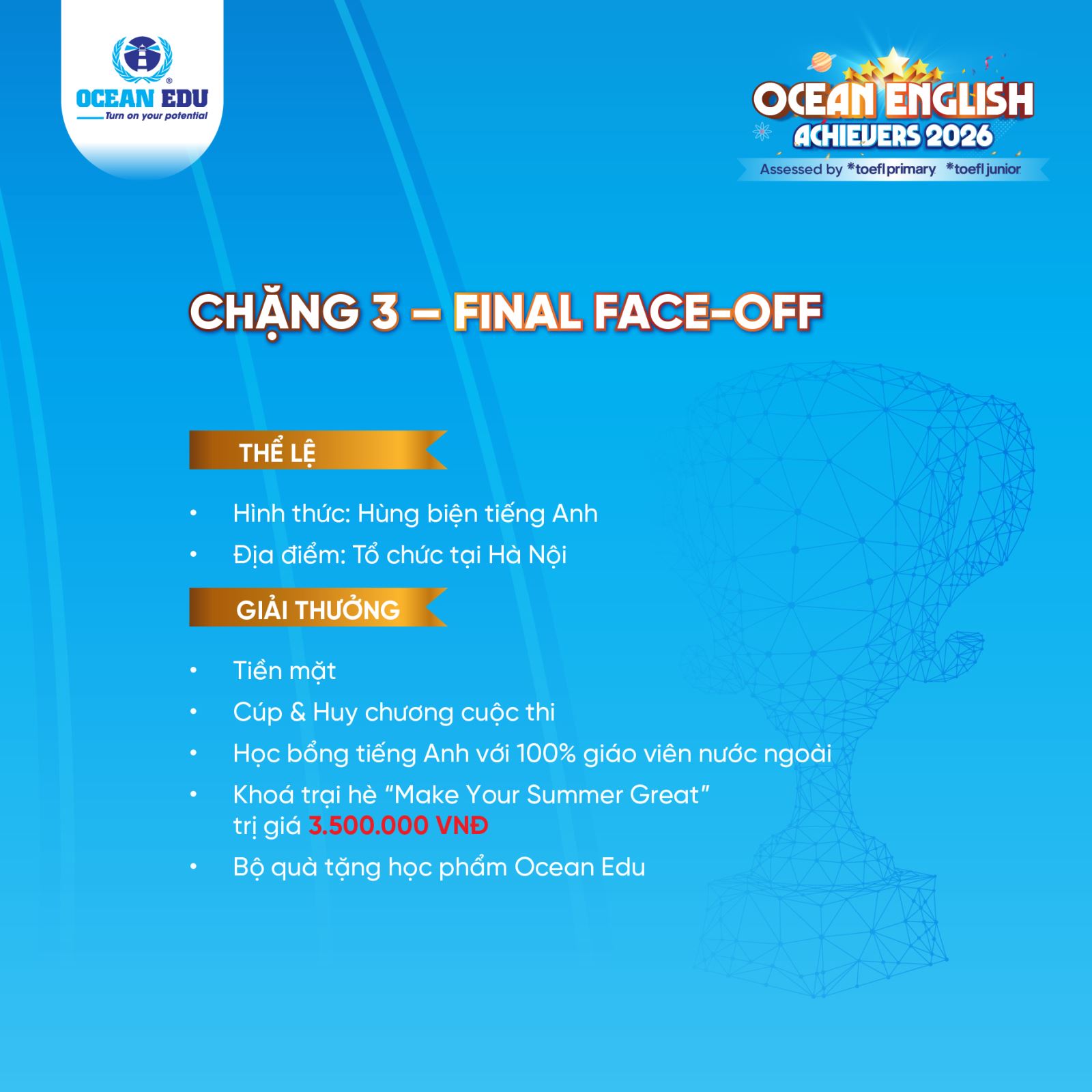 Chặng cuối cùng mang tên Chặng 3: Final - Face off – vòng chung kết đầy kịch tính với hình thức đối đầu trực tiếp. Tại đây, những đại diện xuất sắc nhất sẽ thể hiện bản lĩnh thông qua khả năng lập luận và hùng biện. Các em sẽ được trực tiếp trình bày quan điểm trước ban giám khảo giàu kinh nghiệm, giúp nâng tầm tư duy phản biện và tỏa sáng rạng rỡ.