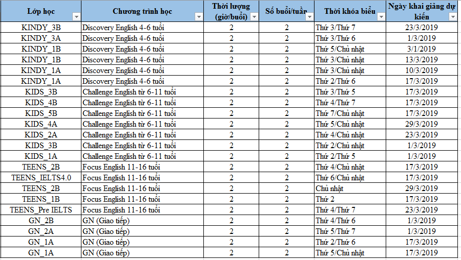 Ocean Edu Phố Nối thông báo đến quý phụ huynh lịch khai giảng các lớp tiếng Anh dự kiến của Ocean Edu Phố Nối trong tháng 1 năm 2020.