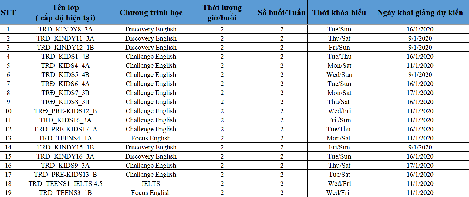 Xem tiếpOcean Edu Triệu Sơn thông báo đến quý phụ huynh lịch khai giảng các lớp tiếng Anh dự kiến của Ocean Edu Triệu Sơn trong tháng 1 năm 2022.