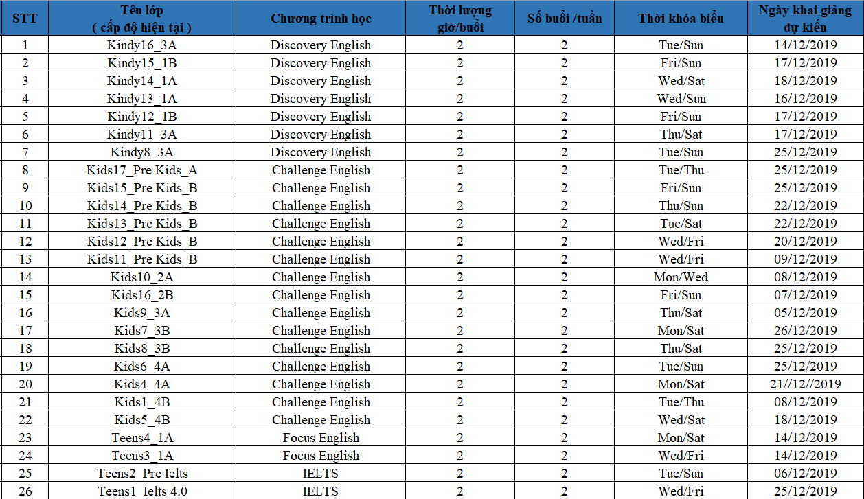 Xem tiếpOcean Edu Triệu Sơn thông báo đến quý phụ huynh lịch khai giảng các lớp tiếng Anh dự kiến của Ocean Edu Triệu Sơn trong tháng 1 năm 2022.