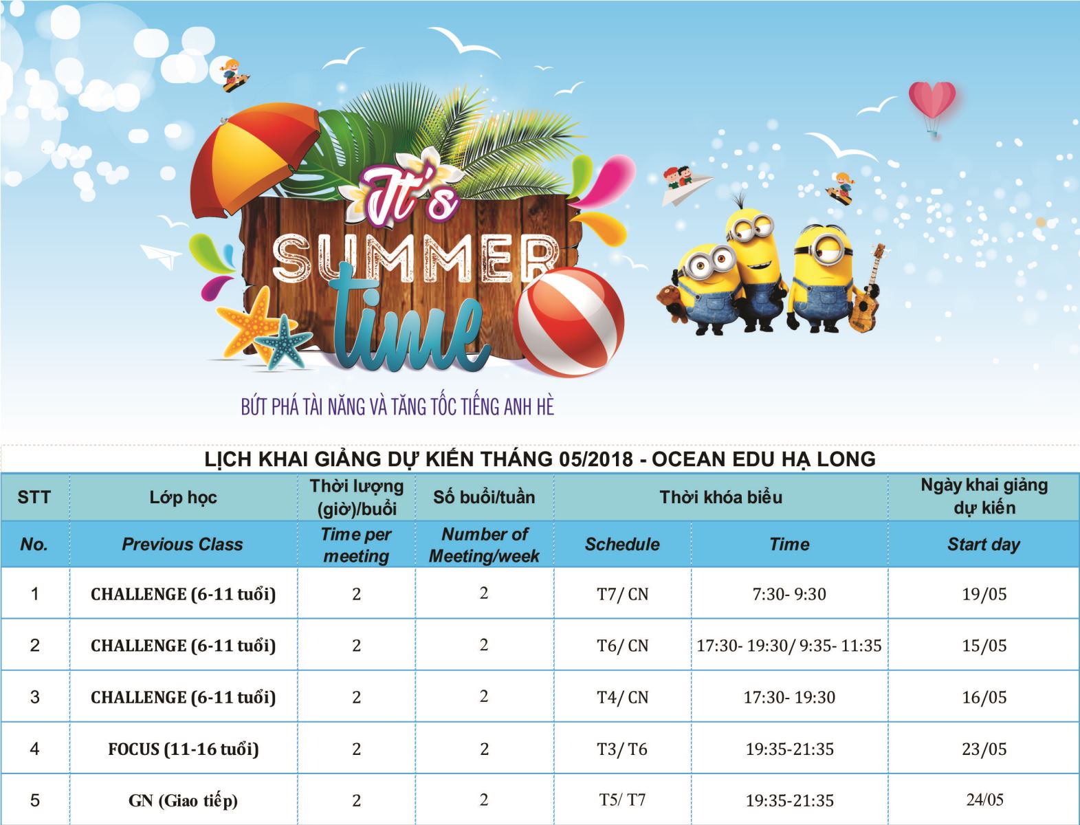 Xem tiếpOcean Edu Hạ Long thông báo đến quý phụ huynh lịch khai giảng các lớp tiếng Anh dự kiến của Ocean Edu Hạ Long trong tháng 10 năm 2019.