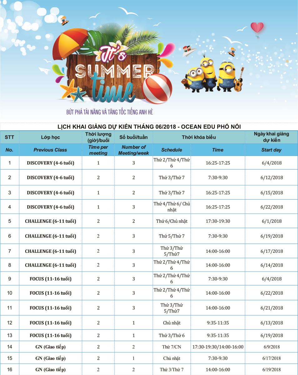 Xem tiếpOcean Edu Phố Nối thông báo đến quý phụ huynh lịch khai giảng các lớp tiếng Anh dự kiến của Ocean Edu Phố Nối trong tháng 09 năm 2019.