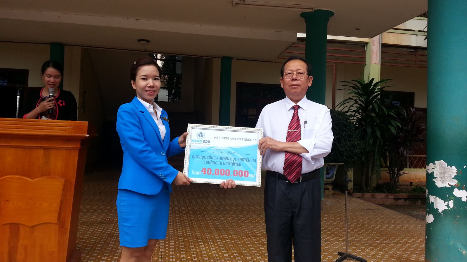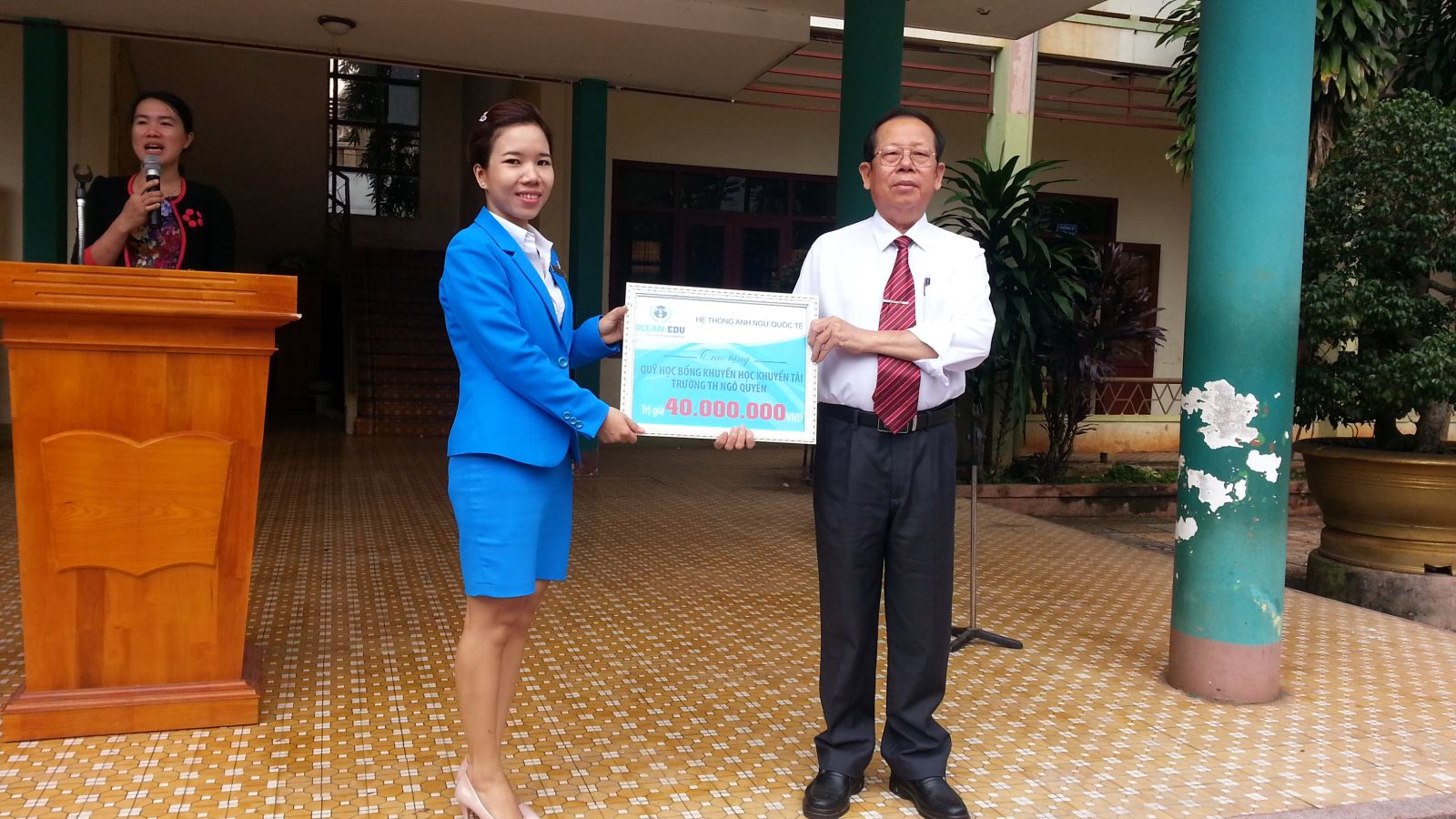 Đại diện của Ocean Edu BMT cô Nguyễn Thị Thoa lên trao học bổng cho trường