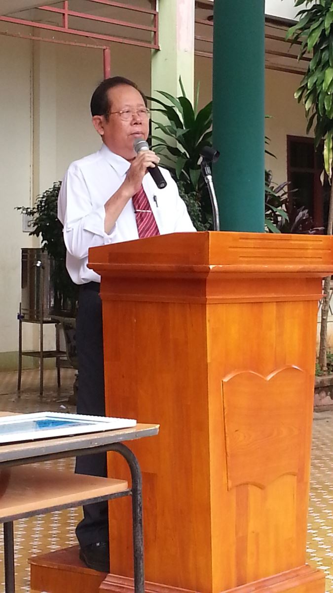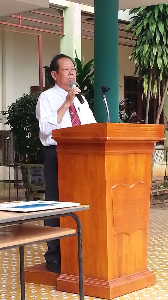 Thầy hiệu trưởng lên phát biểu trước toàn trường