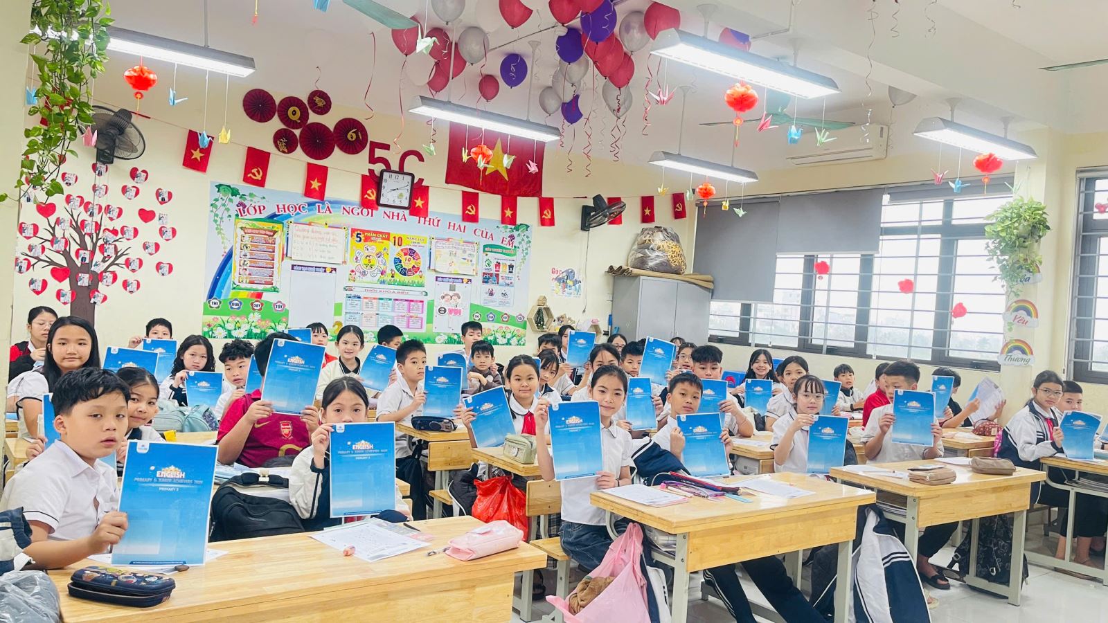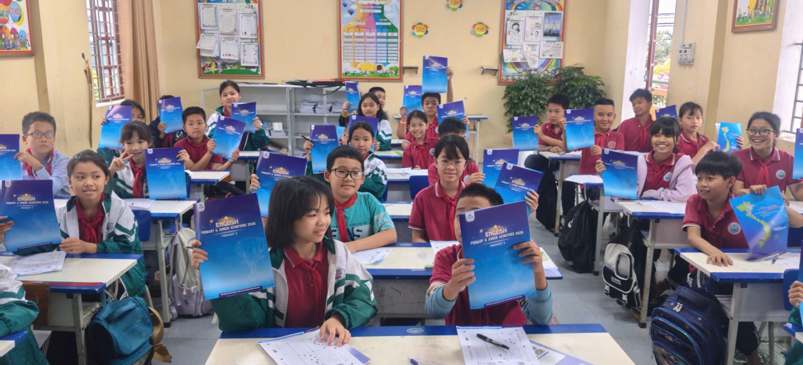 Học sinh hào hứng tham gia và tự tin cầm trên tay bộ đề thi Vòng 1 của cuộc thi Ocean English Achievers 2026.